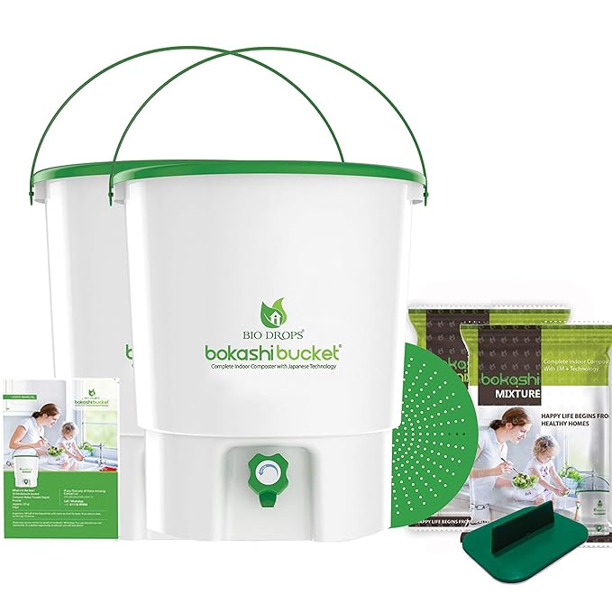 BIO DROPS BOKASHI BUCKET INDOOR COMPOSTER , (White and Blue)ADVANCED JAPANESE TECHNOLOGY Compost Bins For Home Gardening
